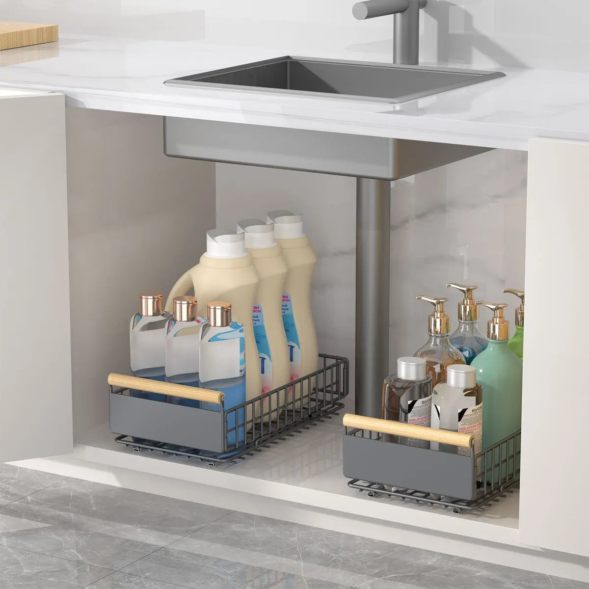 El organizador de 2 piezas para debajo del fregadero tiene una forma cuadrilátera que maximiza el uso del espacio del armario del fregadero. El diseño estrecho superior y ancho inferior deja mucho espacio para sus botellas altas, tuberías y triturador de basura.
